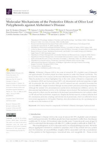 Romero-Márquez, Jose M. and Forbes-Hernández, Tamara Y. and Navarro-Hortal, María D. and Quirantes-Piné, Rosa and Grosso, Giuseppe and Giampieri, Francesca and Lipari, Vivian and Sánchez-González, Cristina and Battino, Maurizio and Quiles, José L. UNSPECIFIED, UNSPECIFIED, UNSPECIFIED, UNSPECIFIED, UNSPECIFIED, francesca.giampieri@uneatlantico.es, vivian.lipari@uneatlantico.es, UNSPECIFIED, maurizio.battino@uneatlantico.es, jose.quiles@uneatlantico.es (2023) Molecular Mechanisms of the Protective Effects of Olive Leaf Polyphenols against Alzheimer’s Disease. International Journal of Molecular Sciences, 24 (5). p. 4353. ISSN 1422-0067