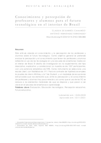 de Barros Camargo, Claudia and Hernández Fernández, Antonio claudia.debarros@unini.edu.mx, UNSPECIFIED (2021) Conocimiento y percepción de profesores y alumnos para el futuro tecnológico en el interior de Brasil. Revista Meta: Avaliação, 13 (38). p. 176. ISSN 2175-2753