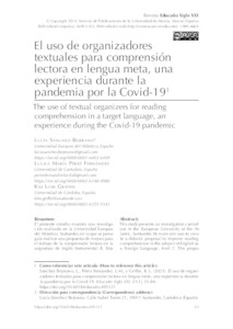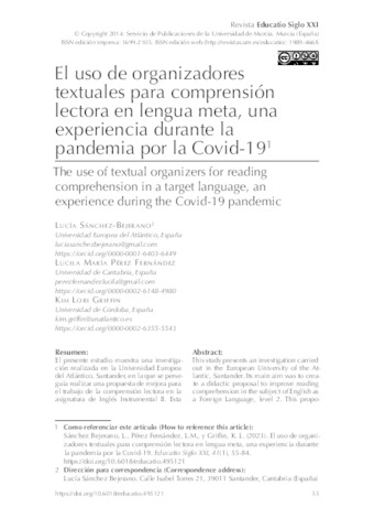 Sánchez-Bejerano, Lucía and Pérez Fernández, Lucila María and Griffin, Kim Lori lucia.sanchez@uneatlantico.es, UNSPECIFIED, UNSPECIFIED (2023) El uso de organizadores textuales para comprensión lectora en lengua meta, una experiencia durante la pandemia por la Covid-19. Educatio Siglo XXI, 41 (1). pp. 55-84.