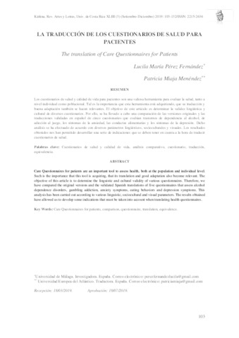 Miaja Menéndez, Patricia and Pérez Fernández, Lucila María UNSPECIFIED (2020) La traducción de los cuestionarios de salud para pacientes. Káñina, 43 (3). pp. 103-132. ISSN 0378-0473