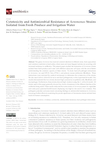 Pintor-Cora, Alberto and Tapia Martínez, Olga and Elexpuru Zabaleta, Maria and Ruiz de Alegría, Carlos and Rodríguez-Calleja, Jose M. and Santos, Jesús A. and Ramos Vivas, Jose UNSPECIFIED, olga.tapia@uneatlantico.es, maria.elexpuru@uneatlantico.es, UNSPECIFIED, UNSPECIFIED, UNSPECIFIED, jose.ramos@uneatlantico.es (2023) Cytotoxicity and Antimicrobial Resistance of Aeromonas Strains Isolated from Fresh Produce and Irrigation Water. Antibiotics, 12 (3). p. 511. ISSN 2079-6382