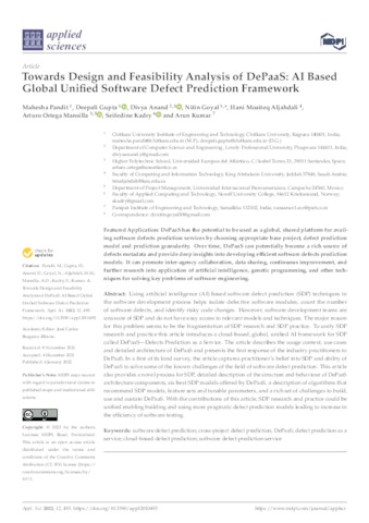 Pandit, Mahesha and Gupta, Deepali and Anand, Divya and Goyal, Nitin and Aljahdali, Hani Moaiteq and Ortega-Mansilla, Arturo and Kadry, Seifedine and Kumar, Arun UNSPECIFIED, UNSPECIFIED, divya.anand@uneatlantico.es, UNSPECIFIED, UNSPECIFIED, arturo.ortega@uneatlantico.es, UNSPECIFIED, UNSPECIFIED (2022) Towards Design and Feasibility Analysis of DePaaS: AI Based Global Unified Software Defect Prediction Framework. Applied Sciences, 12 (1). p. 493. ISSN 2076-3417