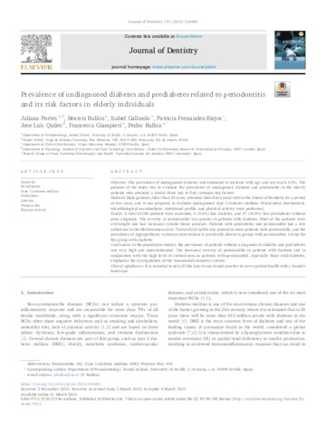Portes, Juliana and Bullón, Beatriz and Gallardo, Isabel and Fernandez-Riejos, Patricia and Quiles, José Luis and Giampieri, Francesca and Bullón, Pedro UNSPECIFIED, UNSPECIFIED, UNSPECIFIED, UNSPECIFIED, UNSPECIFIED, francesca.giampieri@uneatlantico.es, UNSPECIFIED (2023) Prevalence of undiagnosed diabetes and prediabetes related to periodontitis and its risk factors in elderly individuals. Journal of Dentistry, 132. p. 104480. ISSN 03005712