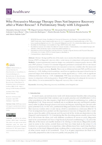 Alonso-Calvete, Alejandra and Lorenzo-Martínez, Miguel and Pérez-Ferreirós, Alexandra and Couso-Bruno, Antonio and Carracedo-Rodríguez, Eloy and Barcala Furelos, Martín and Barcala-Furelos, Roberto and Padrón-Cabo, Alexis UNSPECIFIED, UNSPECIFIED, UNSPECIFIED, UNSPECIFIED, UNSPECIFIED, martin.barcala@uneatlantico.es, UNSPECIFIED, UNSPECIFIED (2022) Why Percussive Massage Therapy Does Not Improve Recovery after a Water Rescue? A Preliminary Study with Lifeguards. Healthcare, 10 (4). p. 693. ISSN 2227-9032