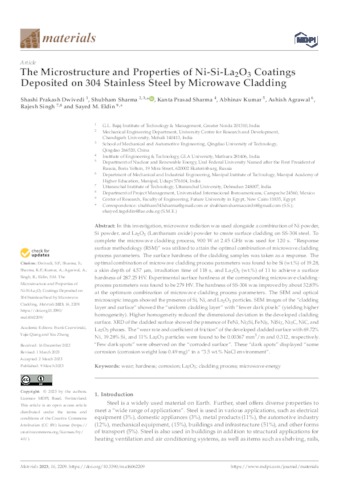 Dwivedi, Shashi Prakash and Sharma, Shubham and Sharma, Kanta Prasad and Kumar, Abhinav and Agrawal, Ashish and Singh, Rajesh and Eldin, Sayed M. UNSPECIFIED (2023) The Microstructure and Properties of Ni-Si-La2O3 Coatings Deposited on 304 Stainless Steel by Microwave Cladding. Materials, 16 (6). p. 2209. ISSN 1996-1944