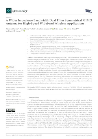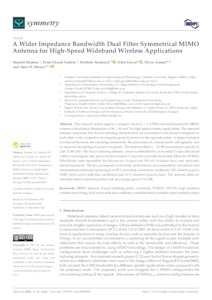 Sharma, Manish and Vashist, Prem Chand and Alsukayti, Ibrahim and Goyal, Nitin and Anand, Divya and Mosavi, Amir H. UNSPECIFIED, UNSPECIFIED, UNSPECIFIED, UNSPECIFIED, divya.anand@uneatlantico.es, UNSPECIFIED (2021) A Wider Impedance Bandwidth Dual Filter Symmetrical MIMO Antenna for High-Speed Wideband Wireless Applications. Symmetry, 14 (1). p. 29. ISSN 2073-8994