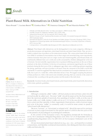 Brusati, Marco and Baroni, Luciana and Rizzo, Gianluca and Giampieri, Francesca and Battino, Maurizio UNSPECIFIED, UNSPECIFIED, UNSPECIFIED, francesca.giampieri@uneatlantico.es, maurizio.battino@uneatlantico.es (2023) Plant-Based Milk Alternatives in Child Nutrition. Foods, 12 (7). p. 1544. ISSN 2304-8158