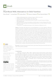 Plant-based milk alternatives can be distinguished in two main categories, differing in production processes and regulation: plant-based formulas and plant-based drinks. They are now a widely accepted class of products on the international market. The various plant-based milk alternatives differ in nutritional characteristics due to their origin and manufacturing; more importantly, whereas formulas from plant and cow origin can be used interchangeably, plant-based drinks are nutritionally different from cow’s milk and can be consumed by children subsequently to the use of formula. Several scientific organizations have expressed differing opinions on the use of these products in the diets of children. In the face of unanimous conclusions regarding the use of these products during the first year of life, in subsequent ages there were conflicting opinions regarding the timing, quantities, and type of product to be used. From the viewpoint of the child’s overall diet and health, it could be suggested that these foods be considered not as simple substitutes for cow’s milk, but as part of a varied diet, within individual advice of use. We suggest accepting the presence of these products in a baby’s diet (omnivores included), planning their use correctly in the context of a balanced diet, according to the specific product and the needs of the individual.