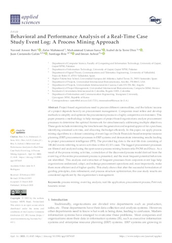 Butt, Naveed Anwer and Mahmood, Zafar and Sana, Muhammad Usman and Díez, Isabel de la Torre and Castanedo Galán, Juan and Brie, Santiago and Ashraf, Imran UNSPECIFIED, UNSPECIFIED, UNSPECIFIED, UNSPECIFIED, juan.castanedo@uneatlantico.es, santiago.brie@uneatlantico.es, UNSPECIFIED (2023) Behavioral and Performance Analysis of a Real-Time Case Study Event Log: A Process Mining Approach. Applied Sciences, 13 (7). p. 4145. ISSN 2076-3417