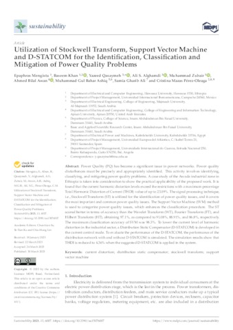 Mengistu, Epaphros and Khan, Baseem and Qasaymeh, Yazeed and Alghamdi, Ali S. and Zubair, Muhammad and Awan, Ahmed Bilal and Ashiq, Muhammad Gul Bahar and Ali, Samia Gharib and Mazas Pérez-Oleaga, Cristina UNSPECIFIED, UNSPECIFIED, UNSPECIFIED, UNSPECIFIED, UNSPECIFIED, UNSPECIFIED, UNSPECIFIED, UNSPECIFIED, cristina.mazas@uneatlantico.es (2023) Utilization of Stockwell Transform, Support Vector Machine and D-STATCOM for the Identification, Classification and Mitigation of Power Quality Problems. Sustainability, 15 (7). p. 6007. ISSN 2071-1050