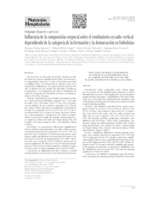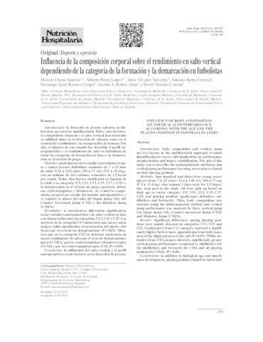 Chena Sinovas, Marcos and Pérez-López, Alberto and Álvarez Valverde, Irene and Bores Cerezal, Antonio and Ramos-Campo, Domingo and Rubio-Arias, Jacobo and Valadés Cerrato, David UNSPECIFIED, UNSPECIFIED, UNSPECIFIED, antonio.bores@uneatlantico.es, UNSPECIFIED, UNSPECIFIED, UNSPECIFIED (2015) Influencia de la composición corporal sobre el rendimiento en salto vertical dependiendo de la categoría de la formación y la demarcación en futbolistas. Nutrición Hospitalaria, 32 (1). pp. 299-307. ISSN 1699-5198