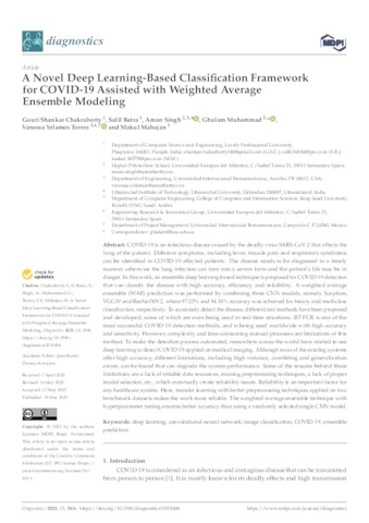 Chakraborty, Gouri Shankar and Batra, Salil and Singh, Aman and Muhammad, Ghulam and Yélamos Torres, Vanessa and Mahajan, Makul UNSPECIFIED, UNSPECIFIED, aman.singh@uneatlantico.es, UNSPECIFIED, vanessa.yelamos@funiber.org, UNSPECIFIED (2023) A Novel Deep Learning-Based Classification Framework for COVID-19 Assisted with Weighted Average Ensemble Modeling. Diagnostics, 13 (10). p. 1806. ISSN 2075-4418