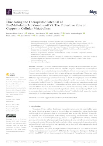 Rivas-García, Lorenzo and López-Varela, Alfonso and Quiles, José L. and Montes-Bayón, María and Aranda, Pilar and Llopis, Juan and Sánchez-González, Cristina UNSPECIFIED, UNSPECIFIED, jose.quiles@uneatlantico.es, UNSPECIFIED, UNSPECIFIED, UNSPECIFIED, UNSPECIFIED (2023) Elucidating the Therapeutic Potential of Bis(Maltolato)OxoVanadium(IV): The Protective Role of Copper in Cellular Metabolism. International Journal of Molecular Sciences, 24 (11). p. 9367. ISSN 1422-0067