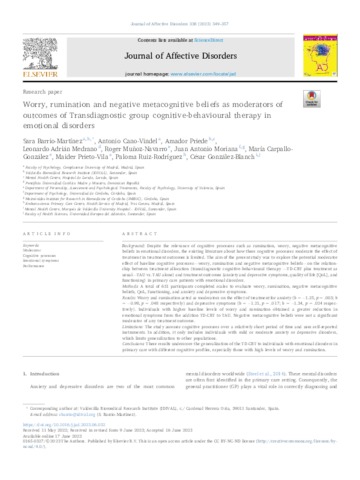 Barrio-Martínez, Sara and Cano-Vindel, Antonio and Priede, Amador and Medrano, Leonardo Adrián and Muñoz-Navarro, Roger and Moriana, Juan Antonio and Carpallo-González, María and Prieto-Vila, Maider and Ruiz-Rodríguez, Paloma and González-Blanch, César UNSPECIFIED, UNSPECIFIED, UNSPECIFIED, UNSPECIFIED, UNSPECIFIED, UNSPECIFIED, UNSPECIFIED, UNSPECIFIED, UNSPECIFIED, cesar.gonzalezblanch@uneatlantico.es (2023) Worry, rumination and negative metacognitive beliefs as moderators of outcomes of Transdiagnostic group cognitive-behavioural therapy in emotional disorders. Journal of Affective Disorders, 338. pp. 349-357. ISSN 01650327