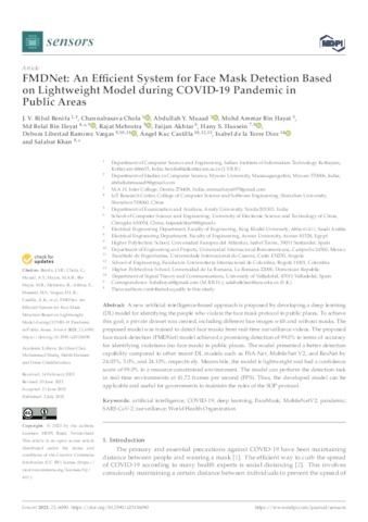 Benifa, J. V. Bibal and Chola, Channabasava and Muaad, Abdullah Y. and Hayat, Mohd Ammar Bin and Bin Heyat, Md Belal and Mehrotra, Rajat and Akhtar, Faijan and Hussein, Hany S. and Ramírez-Vargas, Debora L. and Kuc Castilla, Ángel Gabriel and Díez, Isabel de la Torre and Khan, Salabat UNSPECIFIED, UNSPECIFIED, UNSPECIFIED, UNSPECIFIED, UNSPECIFIED, UNSPECIFIED, UNSPECIFIED, UNSPECIFIED, debora.ramirez@unini.edu.mx, UNSPECIFIED, UNSPECIFIED, UNSPECIFIED (2023) FMDNet: An Efficient System for Face Mask Detection Based on Lightweight Model during COVID-19 Pandemic in Public Areas. Sensors, 23 (13). p. 6090. ISSN 1424-8220