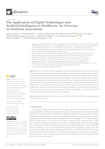 Salinari, Alessia and Machì, Michele and Armas Diaz, Yasmany and Cianciosi, Danila and Qi, Zexiu and Yang, Bei and Ferreiro Cotorruelo, Maria Soledad and Gracia Villar, Santos and Dzul López, Luis Alonso and Battino, Maurizio and Giampieri, Francesca UNSPECIFIED, UNSPECIFIED, UNSPECIFIED, UNSPECIFIED, UNSPECIFIED, UNSPECIFIED, UNSPECIFIED, santos.gracia@uneatlantico.es, luis.dzul@uneatlantico.es, maurizio.battino@uneatlantico.es, francesca.giampieri@uneatlantico.es (2023) The Application of Digital Technologies and Artificial Intelligence in Healthcare: An Overview on Nutrition Assessment. Diseases, 11 (3). p. 97. ISSN 2079-9721