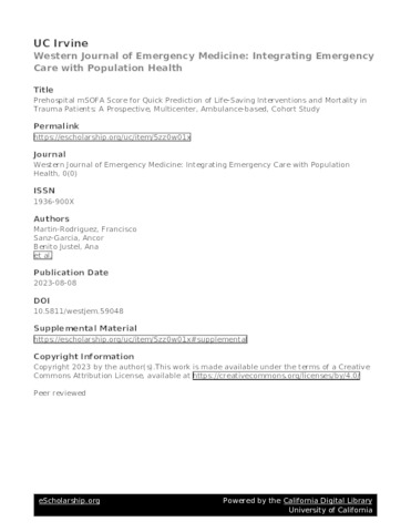 Martin-Rodriguez, Francisco and Sanz-Garcia, Ancor and Benito Justel, Ana and Morales Sánchez, Almudena and Mazas Pérez-Oleaga, Cristina and Delgado Noya, Irene and Sánchez Soberón, Irene and Del Pozo Vegas, Carlos and Delgado Benito, Juan F. and López-Izquierdo, Raúl UNSPECIFIED, UNSPECIFIED, UNSPECIFIED, UNSPECIFIED, cristina.mazas@uneatlantico.es, irene.delgado@uneatlantico.es, UNSPECIFIED, UNSPECIFIED, UNSPECIFIED, UNSPECIFIED (2013) Prehospital mSOFA Score for Quick Prediction of Life-Saving Interventions and Mortality in Trauma Patients: A Prospective, Multicenter, Ambulance-based, Cohort Study. Western Journal of Emergency Medicine. ISSN 1936-900X