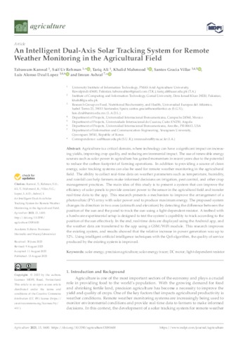 Kanwal, Tabassum and Rehman, Saif Ur and Ali, Tariq and Mahmood, Khalid and Gracia Villar, Santos and Dzul Lopez, Luis and Ashraf, Imran UNSPECIFIED, UNSPECIFIED, UNSPECIFIED, UNSPECIFIED, santos.gracia@uneatlantico.es, luis.dzul@unini.edu.mx, UNSPECIFIED (2023) An Intelligent Dual-Axis Solar Tracking System for Remote Weather Monitoring in the Agricultural Field. Agriculture, 13 (8). p. 1600. ISSN 2077-0472