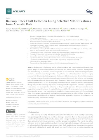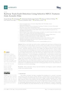 Rustam, Furqan and Ishaq, Abid and Hashmi, Muhammad Shadab Alam and Siddiqui, Hafeez Ur Rehman and Dzul Lopez, Luis and Castanedo Galán, Juan and Ashraf, Imran UNSPECIFIED, UNSPECIFIED, UNSPECIFIED, UNSPECIFIED, luis.dzul@unini.edu.mx, juan.castanedo@uneatlantico.es, UNSPECIFIED (2023) Railway Track Fault Detection Using Selective MFCC Features from Acoustic Data. Sensors, 23 (16). p. 7018. ISSN 1424-8220