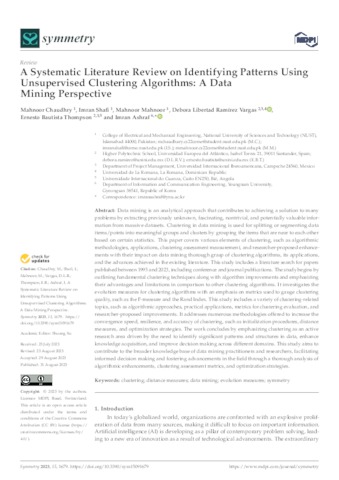 Chaudhry, Mahnoor and Shafi, Imran and Mahnoor, Mahnoor and Ramírez-Vargas, Debora L. and Bautista Thompson, Ernesto and Ashraf, Imran UNSPECIFIED, UNSPECIFIED, UNSPECIFIED, debora.ramirez@unini.edu.mx, ernesto.bautista@unini.edu.mx, UNSPECIFIED (2023) A Systematic Literature Review on Identifying Patterns Using Unsupervised Clustering Algorithms: A Data Mining Perspective. Symmetry, 15 (9). p. 1679. ISSN 2073-8994