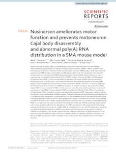 Berciano, María T. and Puente-Bedia, Alba and Medina-Samamé, Almudena and Rodríguez-Rey, José C. and Calderó, Jordi and Lafarga, Miguel and Tapia Martínez, Olga UNSPECIFIED, UNSPECIFIED, UNSPECIFIED, UNSPECIFIED, UNSPECIFIED, UNSPECIFIED, olga.tapia@uneatlantico.es (2020) Nusinersen ameliorates motor function and prevents motoneuron Cajal body disassembly and abnormal poly(A) RNA distribution in a SMA mouse model. Scientific Reports, 10 (1). ISSN 2045-2322