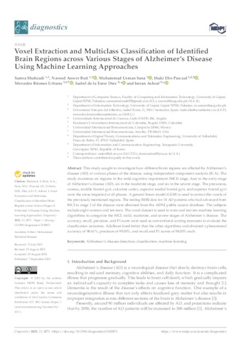 Shahzadi, Samra and Butt, Naveed Anwer and Sana, Muhammad Usman and Elío Pascual, Iñaki and Briones Urbano, Mercedes and Díez, Isabel de la Torre and Ashraf, Imran UNSPECIFIED, UNSPECIFIED, UNSPECIFIED, inaki.elio@uneatlantico.es, mercedes.briones@uneatlantico.es, UNSPECIFIED, UNSPECIFIED (2023) Voxel Extraction and Multiclass Classification of Identified Brain Regions across Various Stages of Alzheimer’s Disease Using Machine Learning Approaches. Diagnostics, 13 (18). p. 2871. ISSN 2075-4418