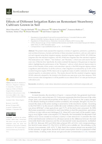 Marcellini, Micol and Raffaelli, Davide and Mazzoni, Luca and Pergolotti, Valeria and Balducci, Francesca and Armas Diaz, Yasmany and Mezzetti, Bruno and Capocasa, Franco UNSPECIFIED, UNSPECIFIED, UNSPECIFIED, UNSPECIFIED, UNSPECIFIED, UNSPECIFIED, bruno.mezzetti@uneatlantico.es, UNSPECIFIED (2023) Effects of Different Irrigation Rates on Remontant Strawberry Cultivars Grown in Soil. Horticulturae, 9 (9). p. 1026. ISSN 2311-7524