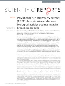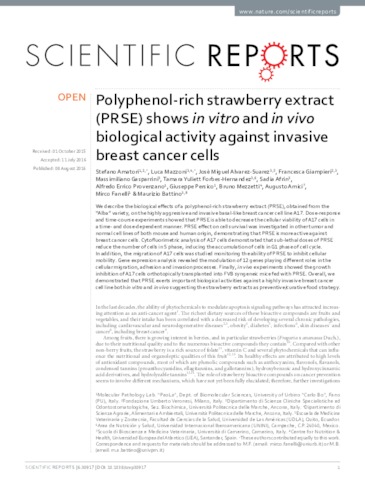 Amatori, Stefano and Mazzoni, Luca and Alvarez-Suarez, José M. and Giampieri, Francesca and Gasparrini, Massimiliano and Forbes-Hernandez, Tamara Y. and Afrin, Sadia and Errico Provenzano, Alfredo and Persico, Giuseppe and Mezzetti, Bruno and Amici, Augusto and Fanelli, Mirco and Battino, Maurizio UNSPECIFIED, UNSPECIFIED, UNSPECIFIED, UNSPECIFIED, UNSPECIFIED, tamara.forbes@unini.edu.mx, UNSPECIFIED, UNSPECIFIED, UNSPECIFIED, UNSPECIFIED, UNSPECIFIED, UNSPECIFIED, maurizio.battino@uneatlantico.es (2016) Polyphenol-rich strawberry extract (PRSE) shows in vitro and in vivo biological activity against invasive breast cancer cells. Scientific Reports, 6 (1). ISSN 2045-2322