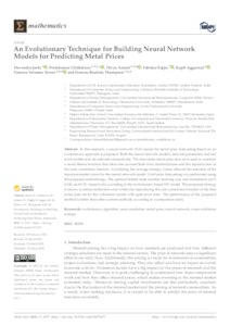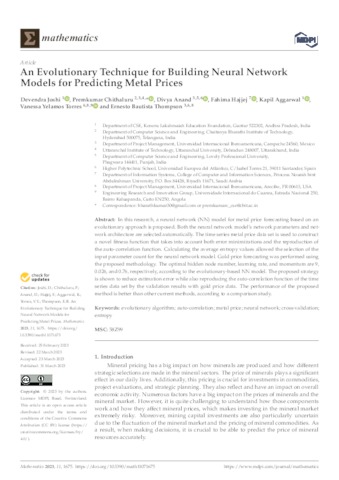 Joshi, Devendra and Chithaluru, Premkumar and Anand, Divya and Hajjej, Fahima and Aggarwal, Kapil and Yélamos Torres, Vanessa and Bautista Thompson, Ernesto UNSPECIFIED, UNSPECIFIED, divya.anand@uneatlantico.es, UNSPECIFIED, UNSPECIFIED, vanessa.yelamos@funiber.org, ernesto.bautista@unini.edu.mx (2023) An Evolutionary Technique for Building Neural Network Models for Predicting Metal Prices. Mathematics, 11 (7). p. 1675. ISSN 2227-7390