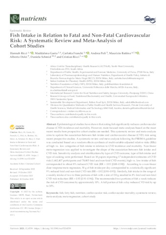 Ricci, Hannah and Gaeta, Maddalena and Franchi, Carlotta and Poli, Andrea and Battino, Maurizio and Dolci, Alberto and Schmid, Daniela and Ricci, Cristian UNSPECIFIED, UNSPECIFIED, UNSPECIFIED, UNSPECIFIED, maurizio.battino@uneatlantico.es, UNSPECIFIED, UNSPECIFIED, UNSPECIFIED (2023) Fish Intake in Relation to Fatal and Non-Fatal Cardiovascular Risk: A Systematic Review and Meta-Analysis of Cohort Studies. Nutrients, 15 (21). p. 4539. ISSN 2072-6643
