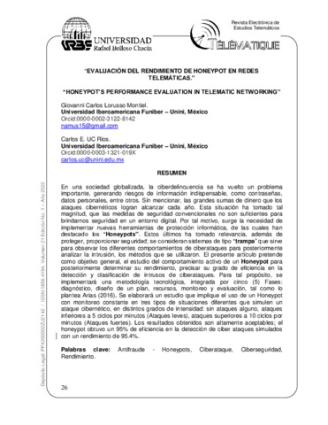 Lorusso Montiel, Giovanni Carlos and Uc Ríos, Carlos Eduardo namus15@gmail.com, carlos.uc@unini.edu.mx (2022) Evaluación del rendimiento de Honeypot en redes telemáticas. TELEMATIQUE, 21 (1). pp. 26-45.