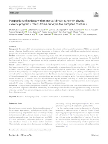 Sweegers, Maike G. and Depenbusch, Johanna and Kampshoff, Caroline S. and Aaronson, Neil K. and Hiensch, Anouk and Wengström, Yvonne and Backman, Malin and Gunasekara, Nadira and Clauss, Dorothea and Peláez, Mireia and Lachowicz, Milena and May, Anne M. and Steindorf, Karen and Stuiver, Martijn M. and Arrieta, Haritz and Toribio, María Gutiérrez and Santillan, María López and Tol, Jolien and Malter, Wolfram and Puppe, Julian UNSPECIFIED, UNSPECIFIED, UNSPECIFIED, UNSPECIFIED, UNSPECIFIED, UNSPECIFIED, UNSPECIFIED, UNSPECIFIED, UNSPECIFIED, mireia.pelaez@uneatlantico.es, UNSPECIFIED, UNSPECIFIED, UNSPECIFIED, UNSPECIFIED, UNSPECIFIED, UNSPECIFIED, UNSPECIFIED, UNSPECIFIED, UNSPECIFIED, UNSPECIFIED (2023) Perspectives of patients with metastatic breast cancer on physical exercise programs: results from a survey in five European countries. Supportive Care in Cancer, 31 (12). ISSN 0941-4355