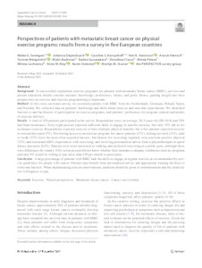Background To successfully implement exercise programs for patients with metastatic breast cancer (MBC), services and patient education should consider patients’ knowledge, preferences, values, and goals. Hence, gaining insight into their perspectives on exercise and exercise programming is important. Method In this cross-sectional survey, we recruited patients with MBC from the Netherlands, Germany, Poland, Spain, and Sweden. We collected data on patients’ knowledge and skills about exercise and outcome expectations. We identified barriers to and facilitators of participation in exercise programs, and patients’ preferences for program content and modes of exercise delivery. Results A total of 420 patients participated in the survey. Respondents were, on average, 56.5 years old (SD 10.8) and 70% had bone metastases. Sixty-eight percent reported sufficient skills to engage in aerobic exercise, but only 35% did so for resistance exercise. Respondents expected exercise to have multiple physical benefits, but a few patients expected exercise to worsen their pain (5%). Not having access to an exercise program for cancer patients (27%), feeling too tired (23%), and/or weak (23%) were the most often reported barriers. Facilitators for exercising regularly were previous positive physical (72%) and emotional (68%) experiences with exercising, and receiving personalized advice from a physiotherapist or sport/fitness instructor (62%). Patients were most interested in walking and preferred exercising at a public gym, although there were differences by country. Fifty-seven percent did not know whether their insurance company reimburses exercise programs and only 9% would be willing to pay more than €50 per month to participate. Conclusion A large percentage of patients with MBC lack the skills to engage in regular exercise as recommended by exercise guidelines for people with cancer. Patients may benefit from personalized advice and appropriate training facilities to overcome barriers. When implementing exercise interventions, attention should be given to reimbursement and the relatively low willingness-to-pay.