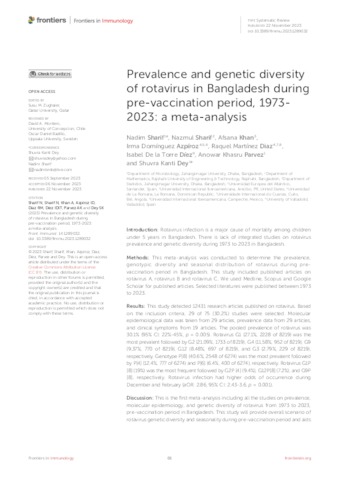 Sharif, Nadim and Sharif, Nazmul and Khan, Afsana and Dominguez Azpíroz, Irma and Martínez Díaz, Raquel and Díez, Isabel De la Torre and Parvez, Anowar Khasru and Dey, Shuvra Kanti UNSPECIFIED, UNSPECIFIED, UNSPECIFIED, irma.dominguez@unini.edu.mx, raquel.martinez@uneatlantico.es, UNSPECIFIED, UNSPECIFIED, UNSPECIFIED (2023) Prevalence and genetic diversity of rotavirus in Bangladesh during pre-vaccination period, 1973-2023: a meta-analysis. Frontiers in Immunology, 14. ISSN 1664-3224